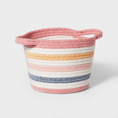 Keep your little one’s room neat and clutter free with the Striped Coiled Rope Storage Bin from Pillowfort™. Featuring a circular silhouette with an open-top design for easy accessibility, this nursery storage bin is great for storing anything from books and craft supplies to small toys and more. Plus, it’s designed with two side handles for easy portability. Made from coiled rope, it features a striped design in red, orange, pink, blue and white to bring a striking color update to their room.
