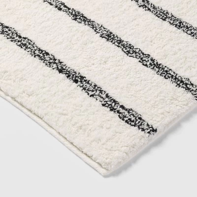 Bring soft texture to their bath space with this Stripe Bath Rug from Pillowfort™. This rectangular bath mat makes a wonderful addition to their bathroom decor. It features a white backdrop with repeated stripes for a modern flair. The 100% cotton construction makes it highly absorbent, while the tufted texture provides them fluffy and soft comfort underfoot when they brush their teeth or step out of the shower. Coordinate with similar bath accessories to bring a cohesive look to their bathroom. Rug pad recommended.